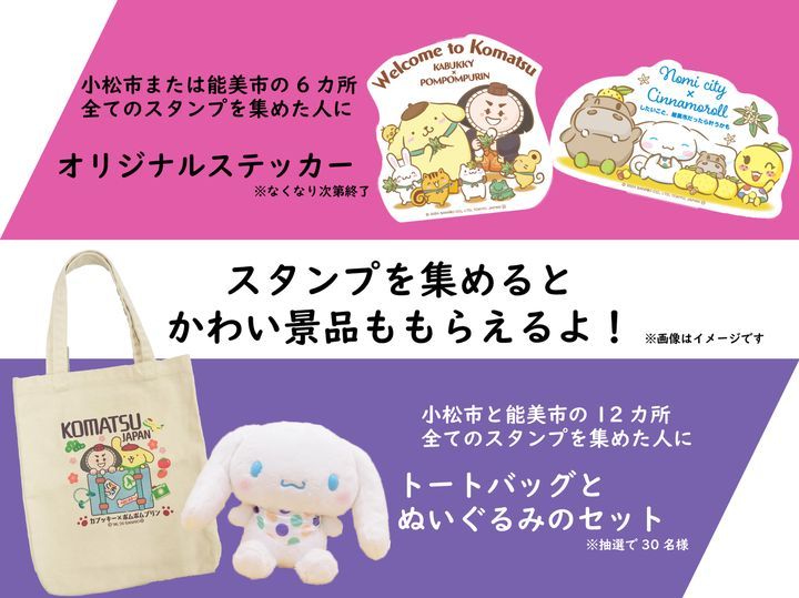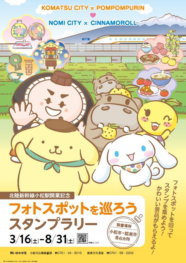 北陸新幹線小松駅では、石川県小松市・能美市でスタンプラリーを行うそうです。スタンプスポットとなる観光施設は合計12カ所。ポムポムプリンと小松市イメージキャラクターのカブッキー、シナモロールと能美市公式キャラクターのひぽ能ん、ゆず美ん、ぽぽ能んが描かれたフォトスポットが設置されているようです!