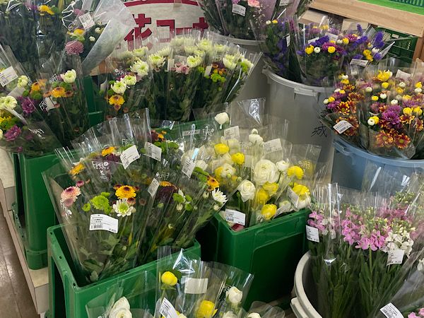 野菜のほかに、お花も。 春のお彼岸用のお花がいくつかありました。そのほかにも、日常使いできる、季節のお花もあります。生き生きとしているお花が多かったですよ。