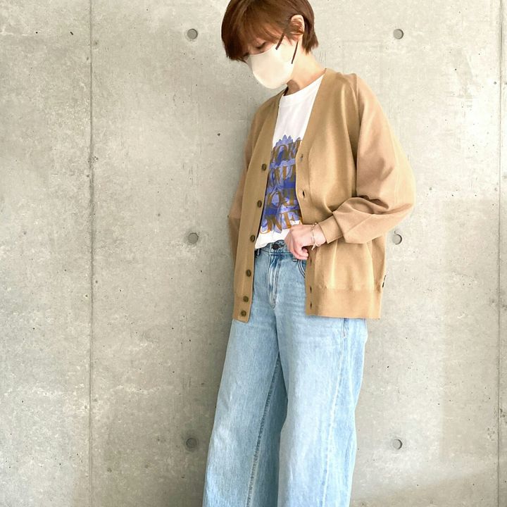 カーディガンなのでもちろん羽織りとしても活躍します。Tシャツに羽織って前を開けて着ると今っぽいこなれ感が出てとってもおしゃれ。半袖は袖が少しだけ透けますが気にしないでOK。春のカジュアルアイテムとして使いましょう。