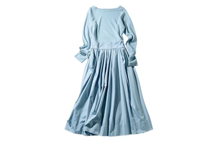 ボートネックのニットと布帛のギャザースカートがドッキング。今年買い足すならペールブルーがイチオシ!ドッキングワンピ¥22,000/ルーニィ