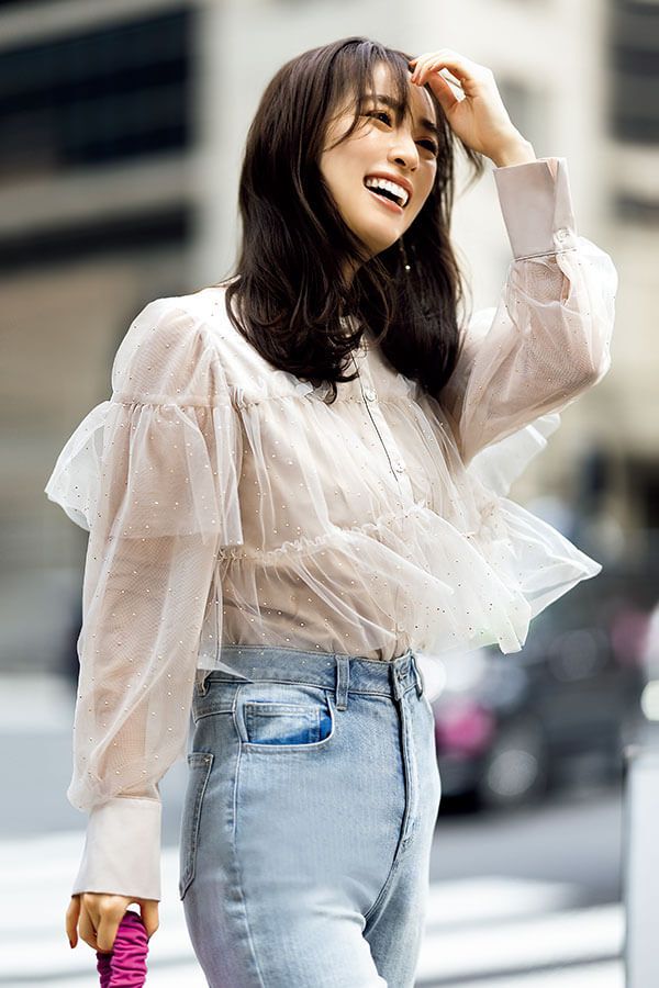 ティアードデザインのシャツは、シアー素材にキラキラをちりばめたときめく1着。甘さが凝縮したデザインも、ベースがシャツなら大人っぽさも上々です。×デニムでラフに着崩せば、こなれ感たっぷりのフェミカジュに。