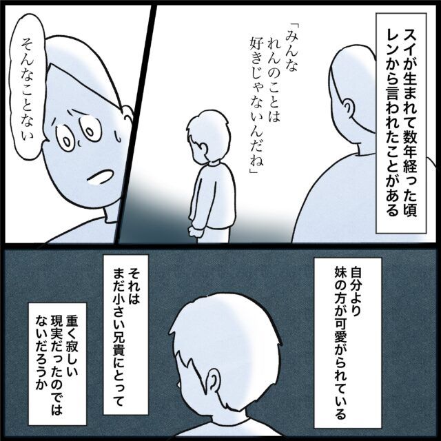 9歳長男レンくん、6歳長女スイちゃん、3歳次男ヨウちゃん、3人のお子さんのママであるはんままさんから、レンくんの成長のお話です。きょうだいがいると、親にそんなつもりはなくても子どもが差を感じてしまうことがありますよね。親戚の中で唯一の女の子で可愛がられるスイちゃんを見て、寂しさを感じていたレンくんですが・・・。