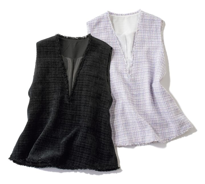 定番になったツイードジレも 春らしいライラックなら新鮮!