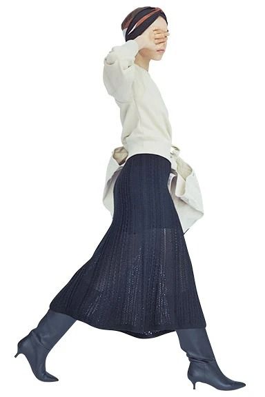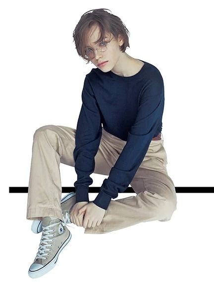 上はレディース・下はメンズ。「本当にふつうのネイビーのニットとチノパン。今でこそ、とくに手を加えない直球のスタンダードに惹かれます。定番どうしのかけ合わせを楽しむということも、そんなアイテムが豊富なユニクロでオシャレする魅力。シンプルな上下でも、たとえばチノはあえてちょっと大きめなメンズサイズを選び、トップスをイン&ウエストをベルトでキュッと締めることでこなれた印象に」(スタイリスト・樋口かほりさん)