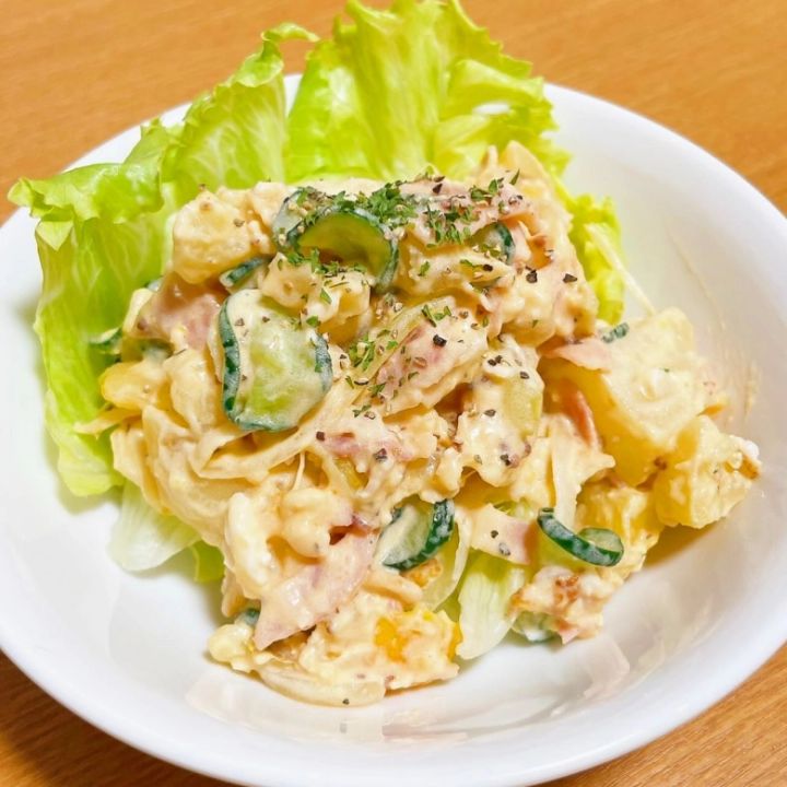 マヨネーズ味で食べやすく、子どもに大人気のポテトサラダ。レタスやきゅうりのシャキシャキ感が、やわらかく煮たミルフィーユ鍋の白菜の食感と対照的ですね。食感の違いを楽しめそうな組み合わせで◎