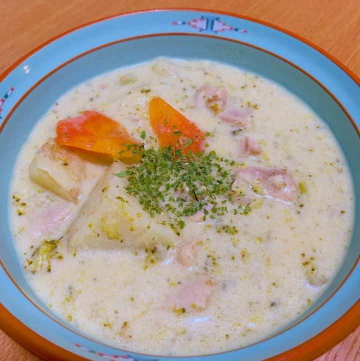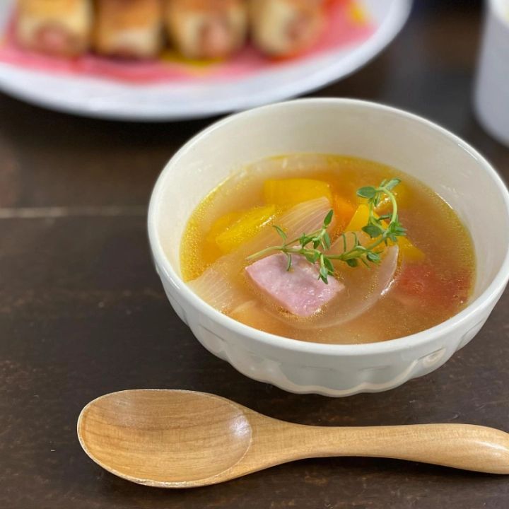 大きめに切った野菜が特徴的なスープ。ミルフィーユ鍋を合わせれば、野菜をたっぷり摂れる食卓のできあがりです。