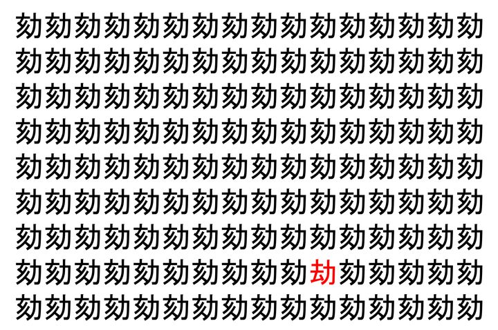 画像の中には、「劾」という漢字が縦に9行、横に16個並んでいます。 全部で144個となりますが・・・、そのうち1つは「異なる漢字」となってますよ!!