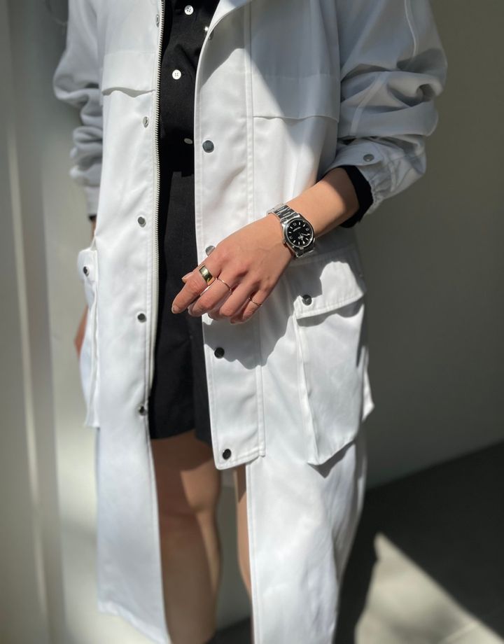 「春先のアウターとしてオススメしたい薄手のコート。コットンタッチのリサイクルポリのサステナブルな素材はもちろん、撥水加工が施されているので汚れがつきにくく、ホワイトでも気兼ねなく着られます。春先は服が軽やかになるので少しゴツい印象の地金系ジュエリーをつけることが多いです」