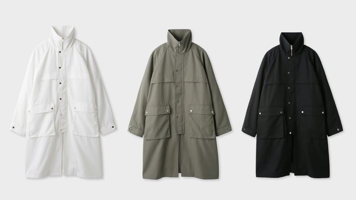 「ユーティリティコートながらメタルのドットボタンがカジュアル過ぎず、オンオフ両用で使えるのも嬉しい」坂上さん着用のホワイトのほか、カーキとネイビーの全3色展開。コート各¥37,400(全てミースロエ)
