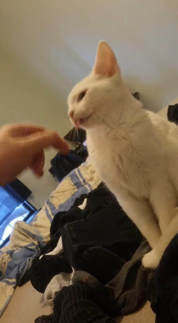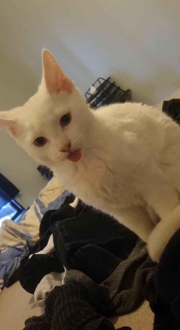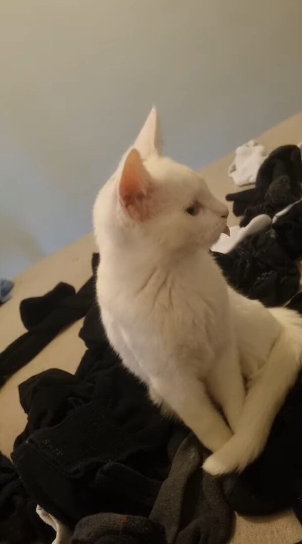 しまい忘れていますよ!洗濯物の山に乗った白猫の舌がペロッと出しっ放し!!【海外・動画】
