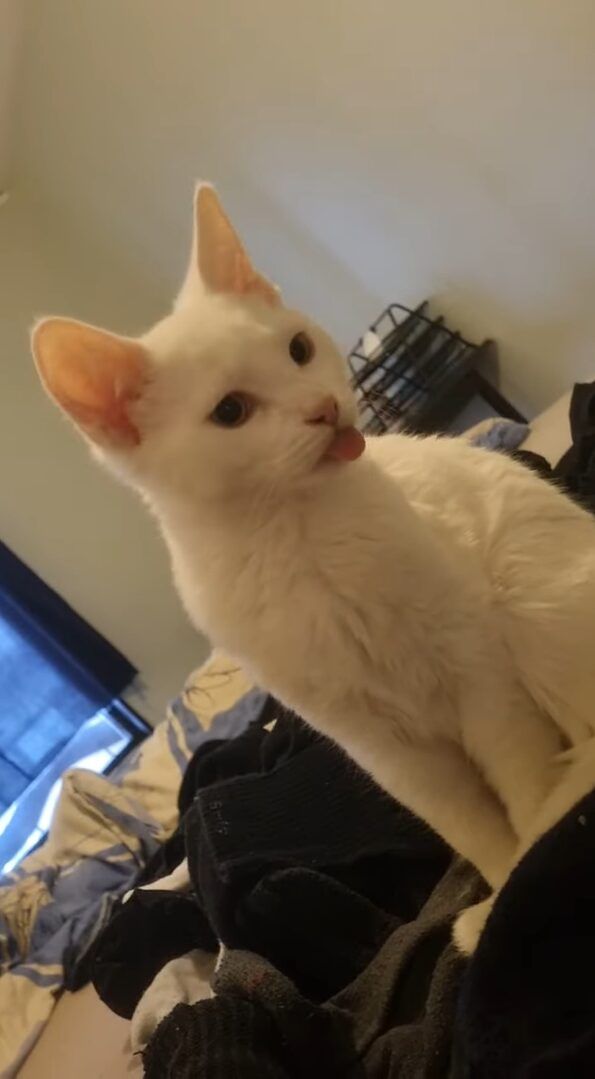 舌がペロッと出しっ放しになっている白猫。 その愛らしい姿は、こちらの動画からご覧いただけます。