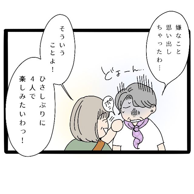 嫌な過去を思い出し青ざめる義母の方をポンとたたき、伯母はニッコリ笑って久しぶりに4人で楽しみたいわ、と言うのでした。