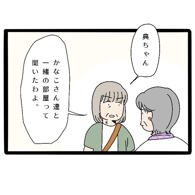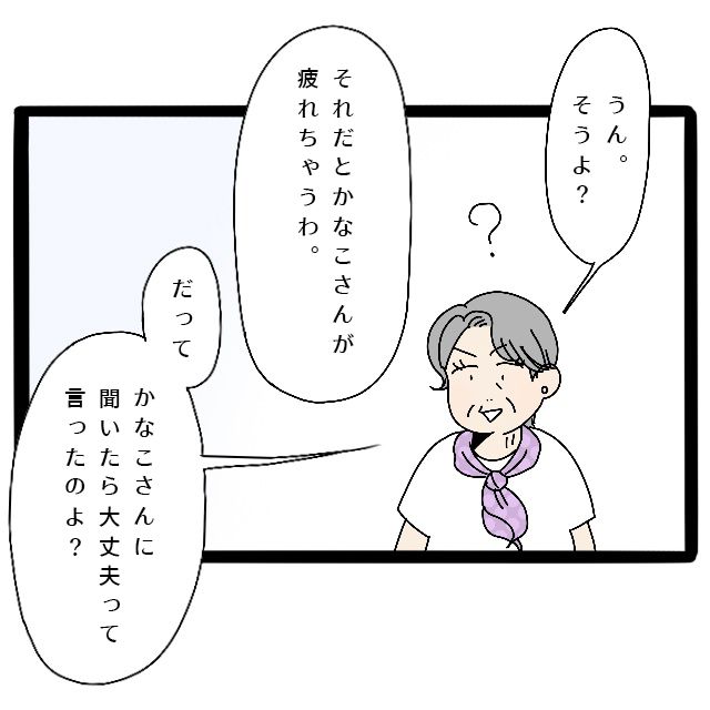 義父母と同室のかなこさんが疲れてしまうとハッキリ言われても、かなこさんに聞いたら「大丈夫」と言ったからだと言う義母は、むしろ伯母が何が言いたいのかわからない様子です。