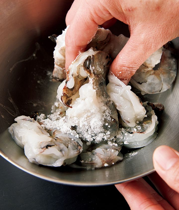 えびは片栗粉をもみ込んで冷水で洗い、臭みをおさえて。さらに片栗粉入りの下味でコーティングすると、プリッとした食感に。