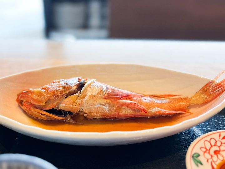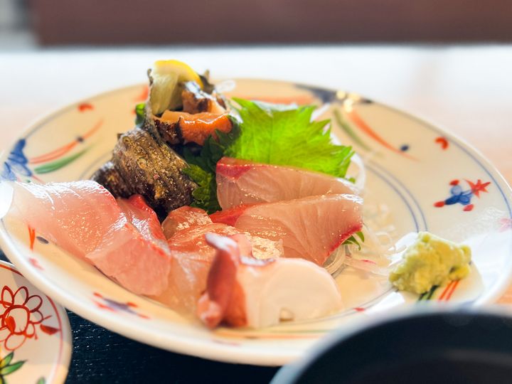伊根でとれたという魚介類はどれも新鮮! 脂の乗った旬のブリの刺身とふんわりやわらかなカサゴの煮魚など、どれも最高の味わいでした。