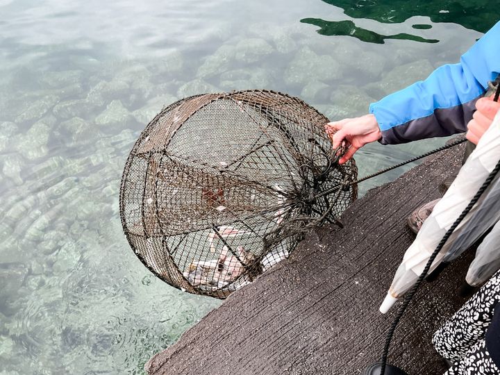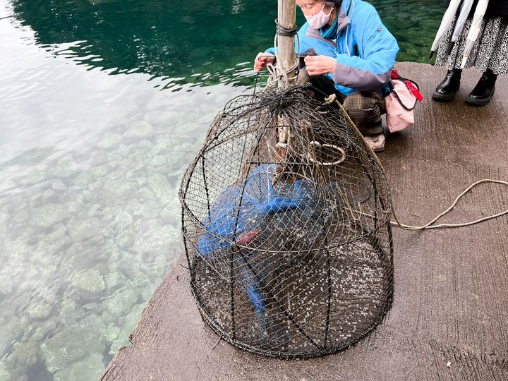 また、ガイドツアーでは”もんどり見学”もできます! もんどり漁は、住民が魚のあらを餌に晩ご飯を調達する仕掛け漁のこと。実際に網を引き上げてみると、この日はなまこが2匹入っていました。