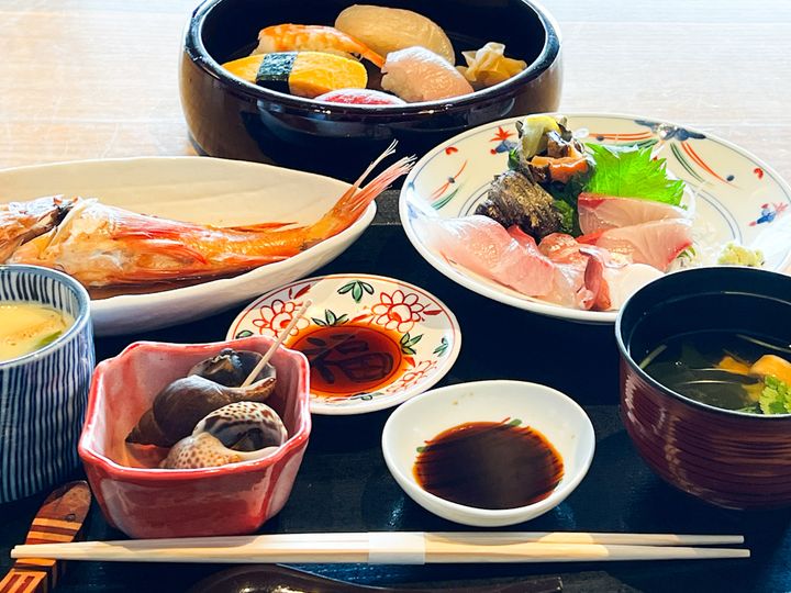 今回いただいたのは、ランチメニューの「わだつみ寿司御膳」(税込3,300円)。早朝、伊根で水揚げされたばかりの鮮魚を使った、寿司5貫、お造り、煮魚などがセットになっています。