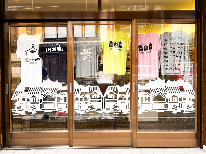 歩いていると、伊根の舟屋群をグラフィックにデザインしたTシャツなどを売っているお店もありました。ガラス扉にもグラフィックが施されていておしゃれ! お土産にもよさそうですよね。