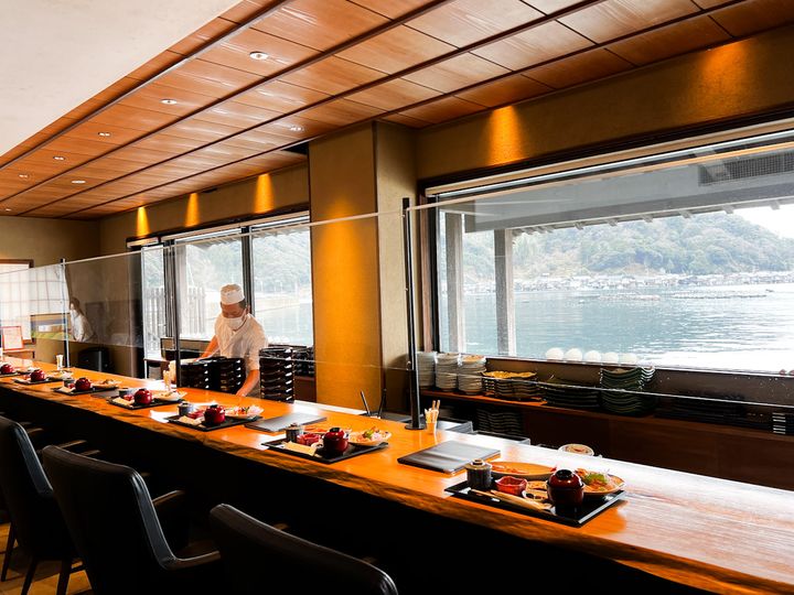 舟屋の街である伊根に来たからには、美味しい海鮮料理も楽しみたいところ。伊根町観光交流施設「舟屋日和」内にある「鮨割烹 海宮 WADATSUMI」では、伊根の海を眺めながら、料理を堪能することができます。