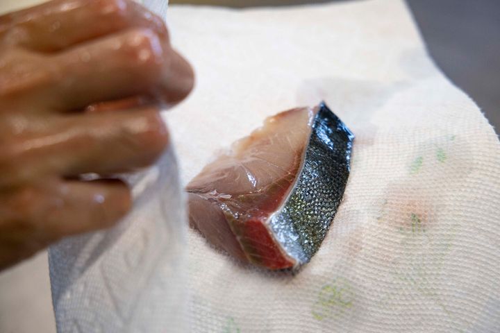 「切り身はどんな状態でさばかれたのかがわかりません。ドリップや細菌が必ず付着しています。まずは水でさっと洗ってからキッチンペーパーでよく拭いてください」
