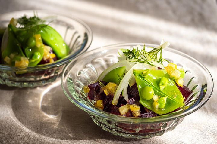素材の甘味が際立つ"スナップえんどうとビーツのサラダレモンドレッシング添え"