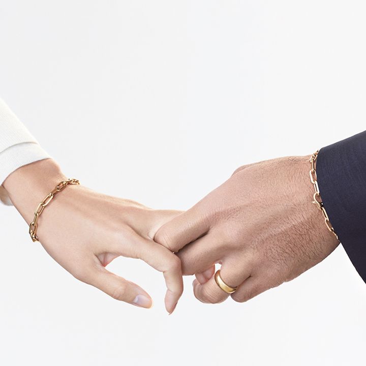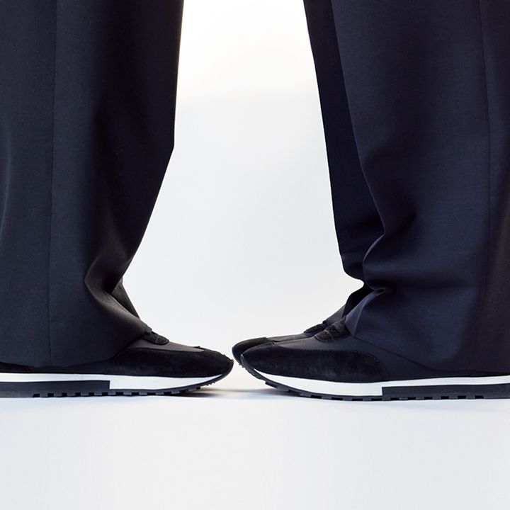 「ジュエリーなどの小物はお揃いでつけることもありましたが、以前はもう少しギラッとしていて、あまり私好みではなかった夫の服装(笑)。私が実店舗でもお買物をするようになり、ザ・ロウやドリス ヴァン ノッテンなどで夫のものも〝ついで買い〟し続けたことで夫のワードローブにも定着し、ここ最近は意識しなくとも自然と2人のトーンが揃ってきた気がします。私のジレとパンツ、夫のセットアップと、2人のスニーカーをザ・ロウでリンク」