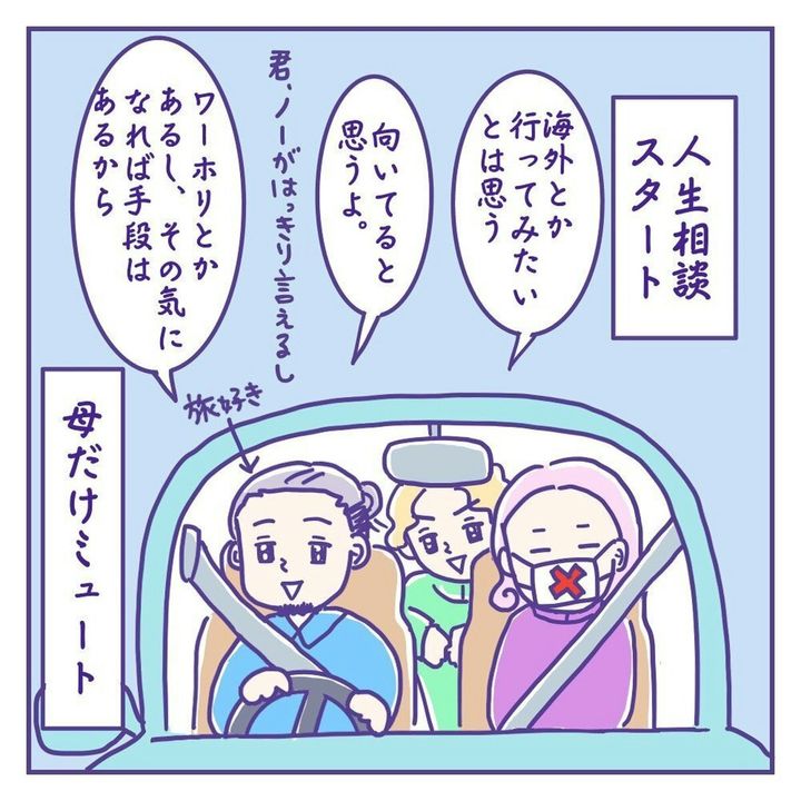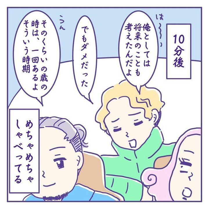 このお話は、シングルマザー・ひよっこ(@hiyocco_hiyoco)さんの息子2人と、息子たちには秘密で付き合っていたパートナーが、なぜか急接近することになった日々のお話です。長男の専門学校の退学手続き後、パートナー・リキシが車で迎えにやってきます。「今日は落ちてるから喋んない」と言っていた長男でしたが、数分後には口数が増え、男同士の人生相談が始まるのでした。『わたしと彼とこどもたち』第16話をごらんください。