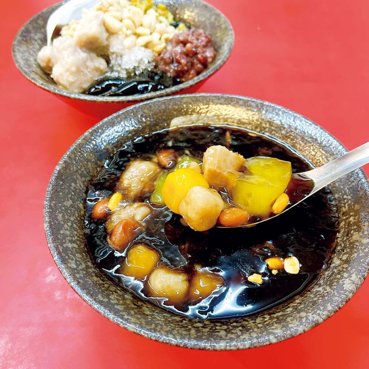 肌寒い季節になると、スイーツ店の壁に「燒仙草上市」(燒仙草の販売を始めました)と書かれた紙が張り出される。台湾の冬の風物詩であり、これを見ると心が躍る。見た目は真っ黒なのでちょっぴり驚くが、とろりとした温かい液体状のスイーツが体に染み込んでいくと、身も心も温まる。原料はでんぷんやペクチンを含むシソ科の植物「仙草」で、乾燥させた茎や葉を煮出して作る。ほんのりと苦味を感じるが、芋団子や小豆などをトッピングし、これが程よい甘さとなる。さらに数粒のピーナッツを加えるのが定番。塩気とカリッとした食感がいいアクセントになっている。夏場は冷やしたゼリー状のもの「仙草凍」(第6回で紹介)が一般的で、季節によって異なる食べ方を楽しむ。