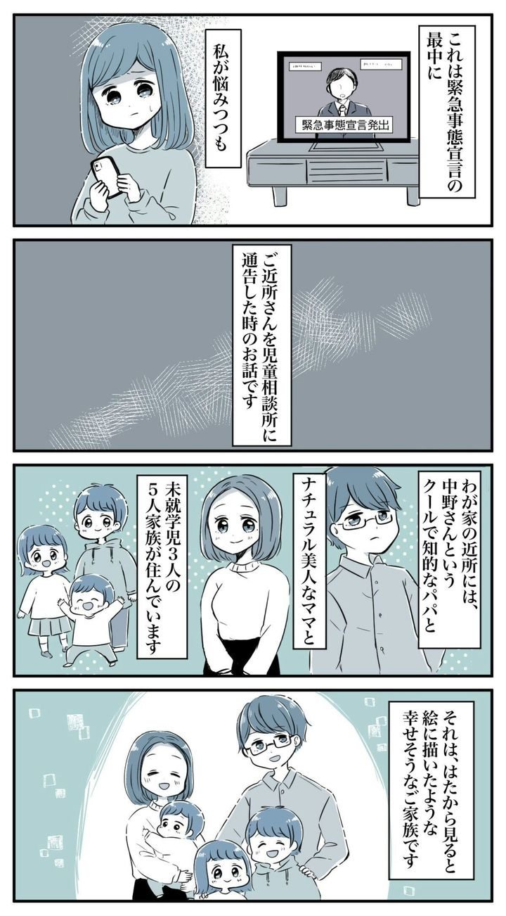 これはあるママの体験をもとにしたお話です。主人公のママは最近引っ越してきた中野家とはあいさつをする程度の仲でした。幸せそうな5人家族に見えていたのですが、ある日、道ですれ違ったとき耳にした中野家の母親の声に、ドキッとします。