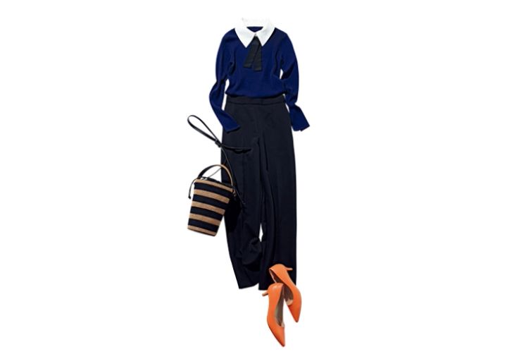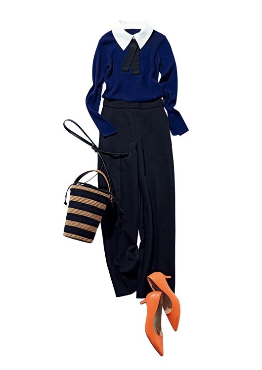 襟付きニットは、体につかず離れずのリブ素材。白襟とタイがエレガントだから、黒パンツ合わせでも十分もちます。どんな小物も合うコーデだけれど、明るくいくならバケツバッグ×オレンジ靴を選んで。