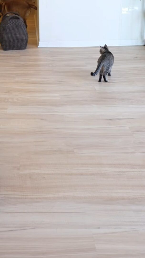 呆然と立ちつくす子猫と、空っぽになったバスケットを虚しく運ぶ愛犬。