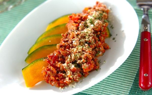 カボチャにミートソースをかけるだけで、子どもが喜ぶ一品に大変身! カボチャの甘みとミートソースの旨味がちょうど良いです。カボチャはレンジで加熱しましょう。ミートソースさえあれば時短で作れますよ。