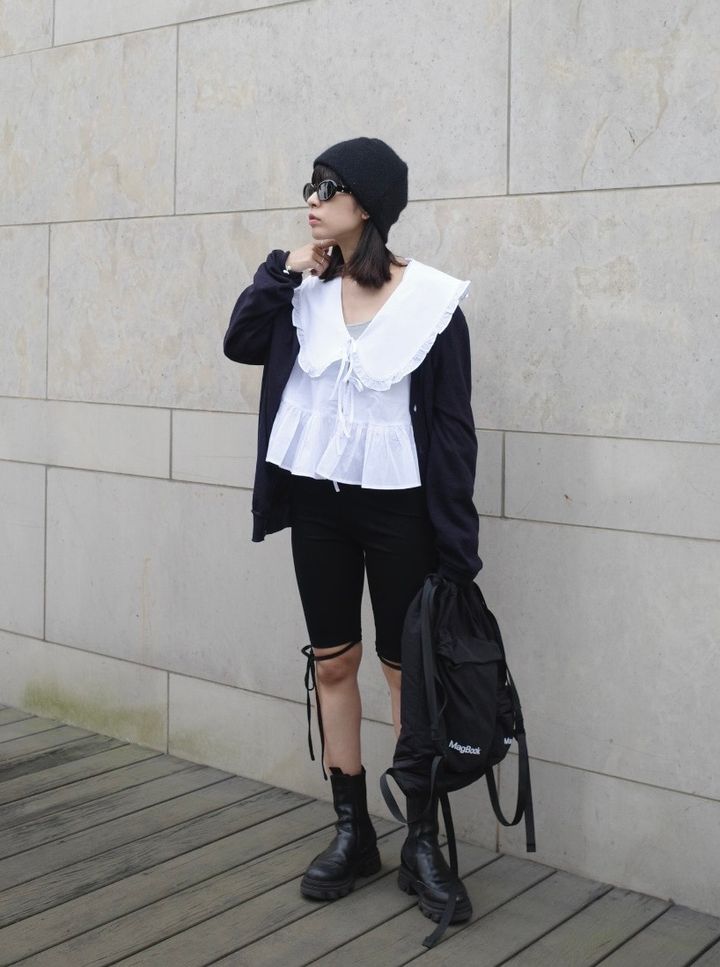 韓国で購入したブラウス、Maison Margielaのカーディガン、ROSARYMOONのレギンス、La Maison de Lyllisのビーニー、Same Paperのバッグ、Maison Margiela×GENTLE MONSTERのサングラス、GANNIのブーツは本人私物