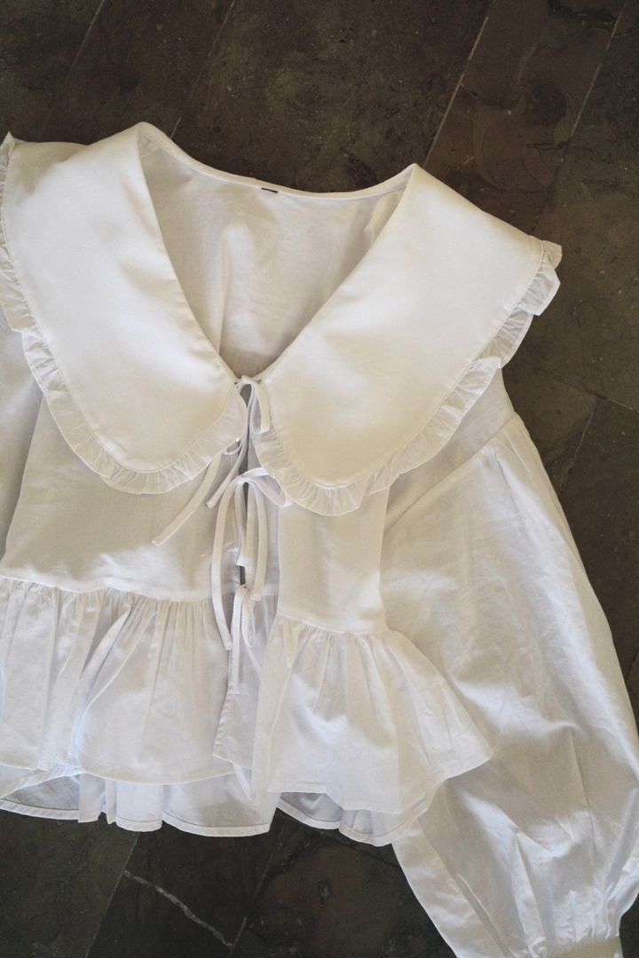 「ビッグカラーが印象的なフリルブラウスをメインに、ショートレギンスを合わせてカジュアルにまとめました。フリルやリボンのガーリーな要素でコーデが甘くなり過ぎないように、サングラスやボリュームのあるブーツなどでスパイスをきかせてバランスを意識しています」