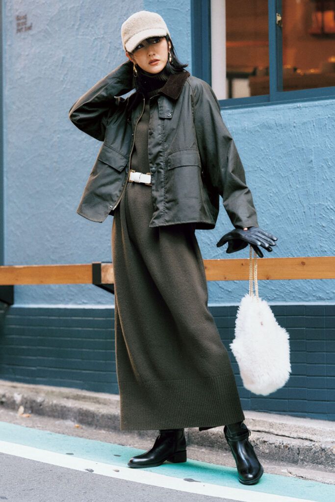 どんなカラーにも馴染みつつ、時に女性らしさを際立出せてくれるカーキ。ワンピースとして楽しむときは、メンズライクなショート丈ブルゾンでテイストMIXさせるのがおすすめです。ふわもこ小物や革小物を加えて、甘くなり過ぎない大人の休日コーデに仕上げて。