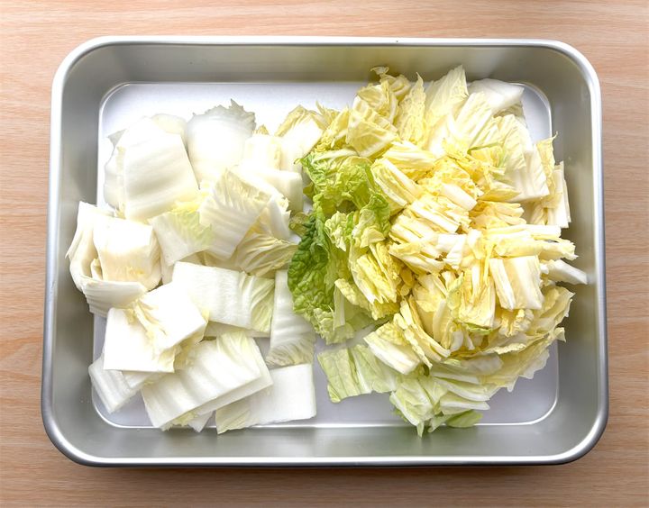 2でカットした白菜の固い部分を、先に4のフライパンに入れて煮込み、やわらかくしておきます。