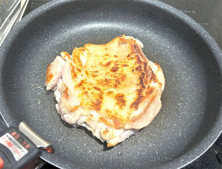 別のフライパンを準備し、3の鶏肉の皮面を焼いていきます。