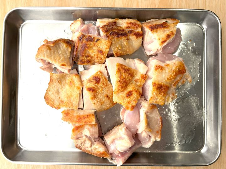 粗熱が取れたら、鶏肉は一口大に切り分けておきましょう。
