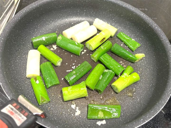 5のフライパンを洗わないまま、2の長ねぎをフライパンに入れて焼きます。