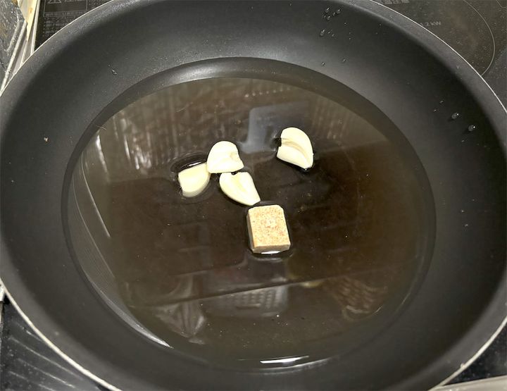フライパンに水とチキンコンソメの素、2で半分にカットしたにんにくを入れて火にかけます。