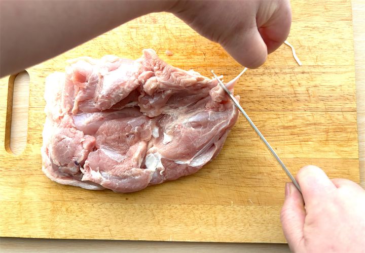 鶏もも肉は皮を下にしてまな板に置き、筋や軟骨、余分な脂身を取り除きます。