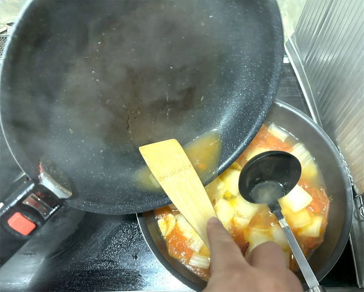 動画では、4で煮込んでいるトマトだしを少量加えて同様にしてもOKとのことだったので、わたしはトマトだしでフライパンの旨味をこそげ落としています。