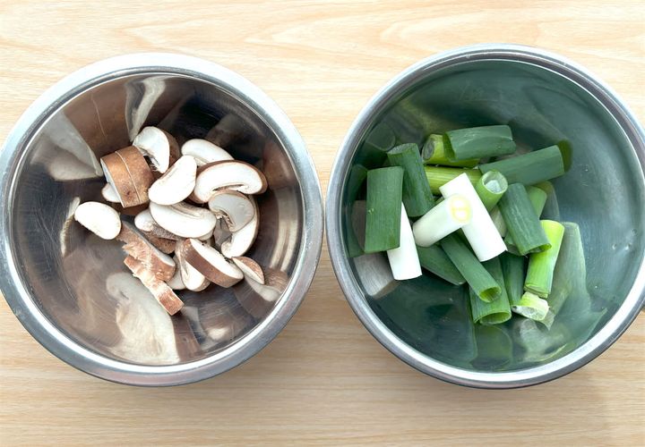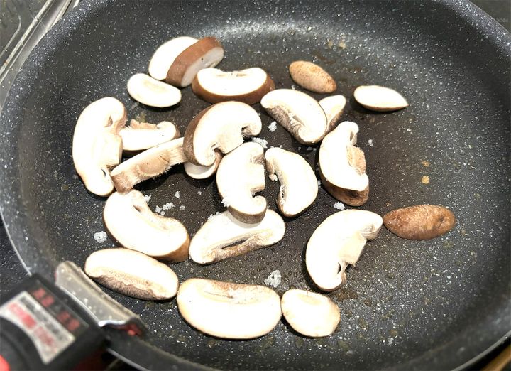 ねぎが焼けたら、フライパンから取り出し、続けて2のしいたけをフライパンに入れ、軽く塩(分量外)を振ってから、しいたけがしんなりするまで焼きます。