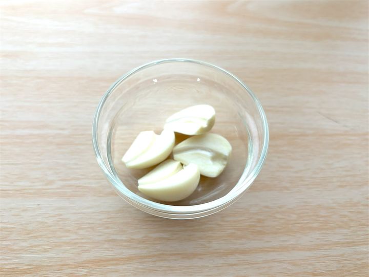 にんにくは、半分にカットして中の芽を取り除いておきましょう。