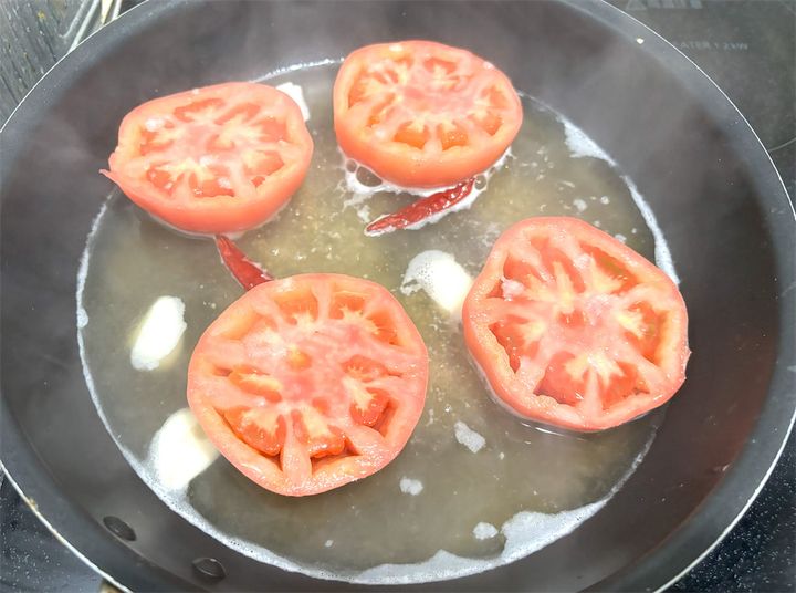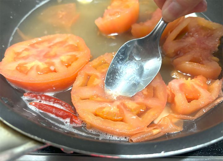 1~2分経ったらトマトを裏返して、スプーンの背でトマトを軽く潰して更に煮込んでいきます。