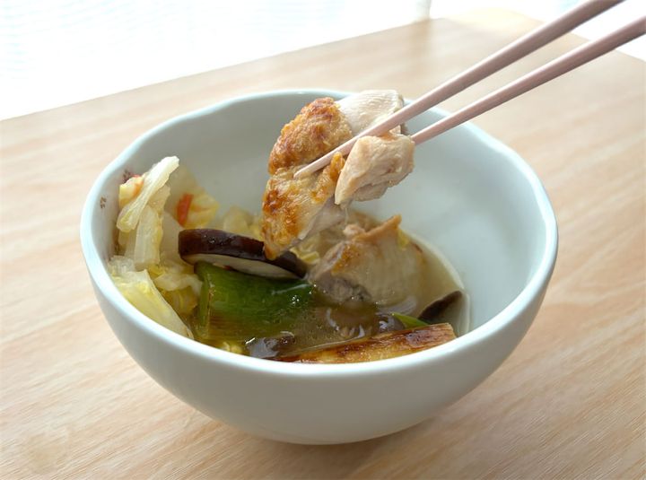調味料は、分量外で具材にひと振りしていった「塩」だけですが、トマトや鶏肉、長ねぎ、しいたけといった具材からしっかりおいしいだしが出ており、物足りなさは全く感じない、本当においしい「トマト鍋」でした。