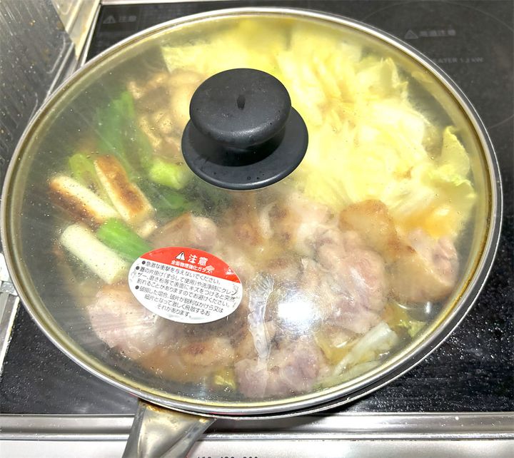 7のフライパンで、白菜の固い部分がやわらかくなったのを確認したら、2でカットした白菜の葉の部分、5の鶏肉、6で焼いた長ねぎとしいたけを入れて、フタをします。