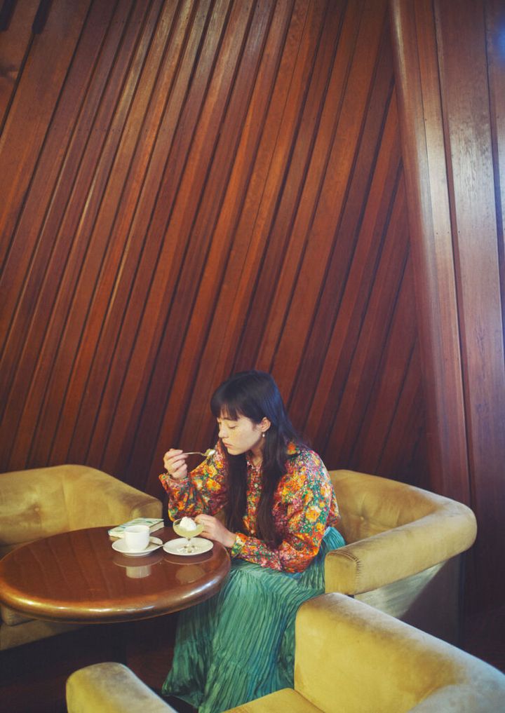 八坂神社からも程近い『ぎおん石 喫茶室』で一休み。壁から天井にかけて有機的に張り巡らされた木材や球体の照明、レトロなテーブルやソファまで、昭和の趣を残す店内で、自家製レモンゼリーとブレンドコーヒーのセット(¥1,000)を。ゼリーの程よい酸味がクセになる。京都市東山区祇園町南側555−2F 075−561−2458 11:30〜19:00 水休 シャツ¥31,900(エンジニアド ガーメンツ/ネペンテス ウーマン トウキョウ 03−5962−7721)スカート¥191,400(WMV/ダブリュー エム ブイ ビズビム トウキョウ 03−6303−3717)