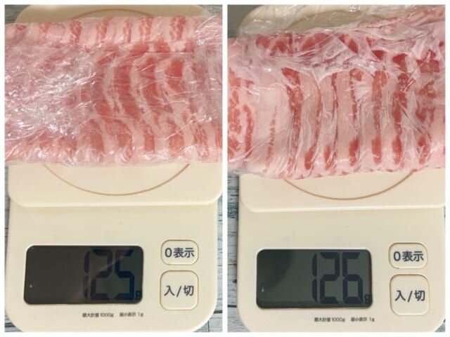 プレートを使わない豚バラ肉125g、プレートを使った豚バラ肉126g。1g誤差がありますが、ほぼ同じグラム数の豚バラ肉を解凍していきます。室内はエアコンは使わず20℃ほどの室内で検証スタート。