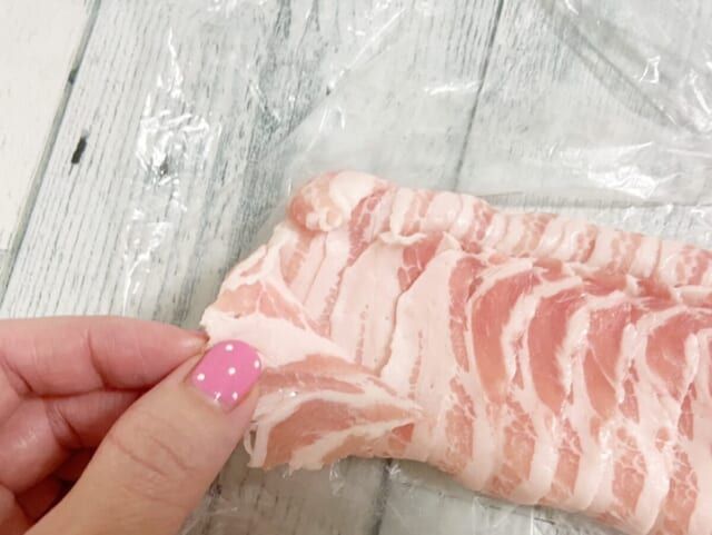 豚バラ肉をはがそうとしたのですが、まだ中心部分が凍っているのできれいに1枚ずつはがすには少し早かった様子。